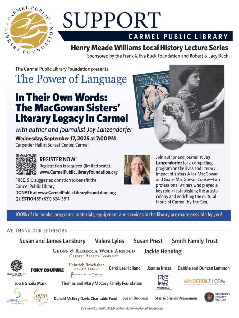 The Carmel Public Library invited me to speak about Alice and Grace MacGowan, two popular novelists who lived in Carmel starting in 1908.